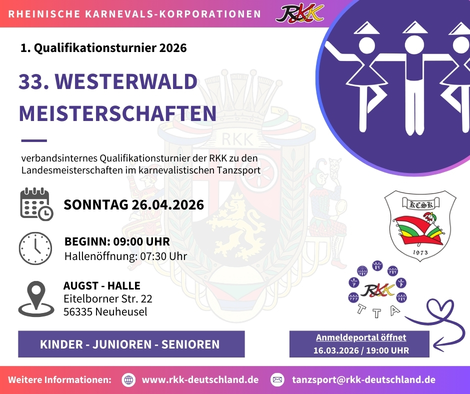 Anmeldeportal öffnet am 16.03.2026 - 18:00 UHR Anmeldeschluss: 13.04.2026 - 22:00 UHR Startgelder sind zu zahlen bis: 14.04.2026 - 18:00 UHR Auslosung durch den Tanzturnierausschuss: 15.04.2026 - 18:00 UHR